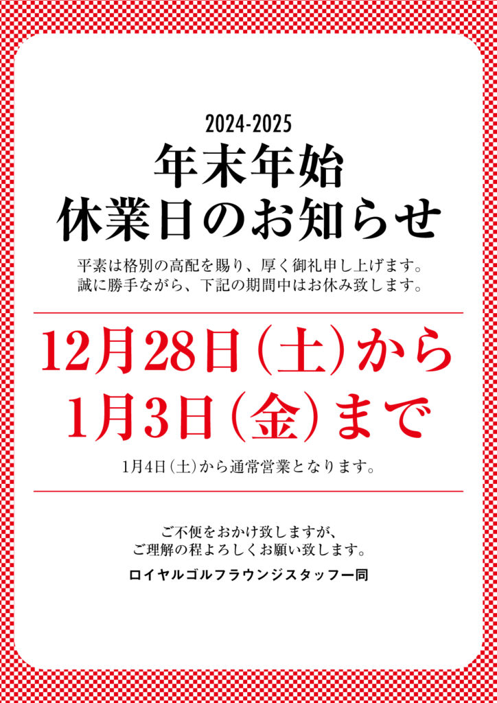 ロイヤルゴルフラウンジは、12/28(土)から1/3(金)まで、お休みさせていただきます。
